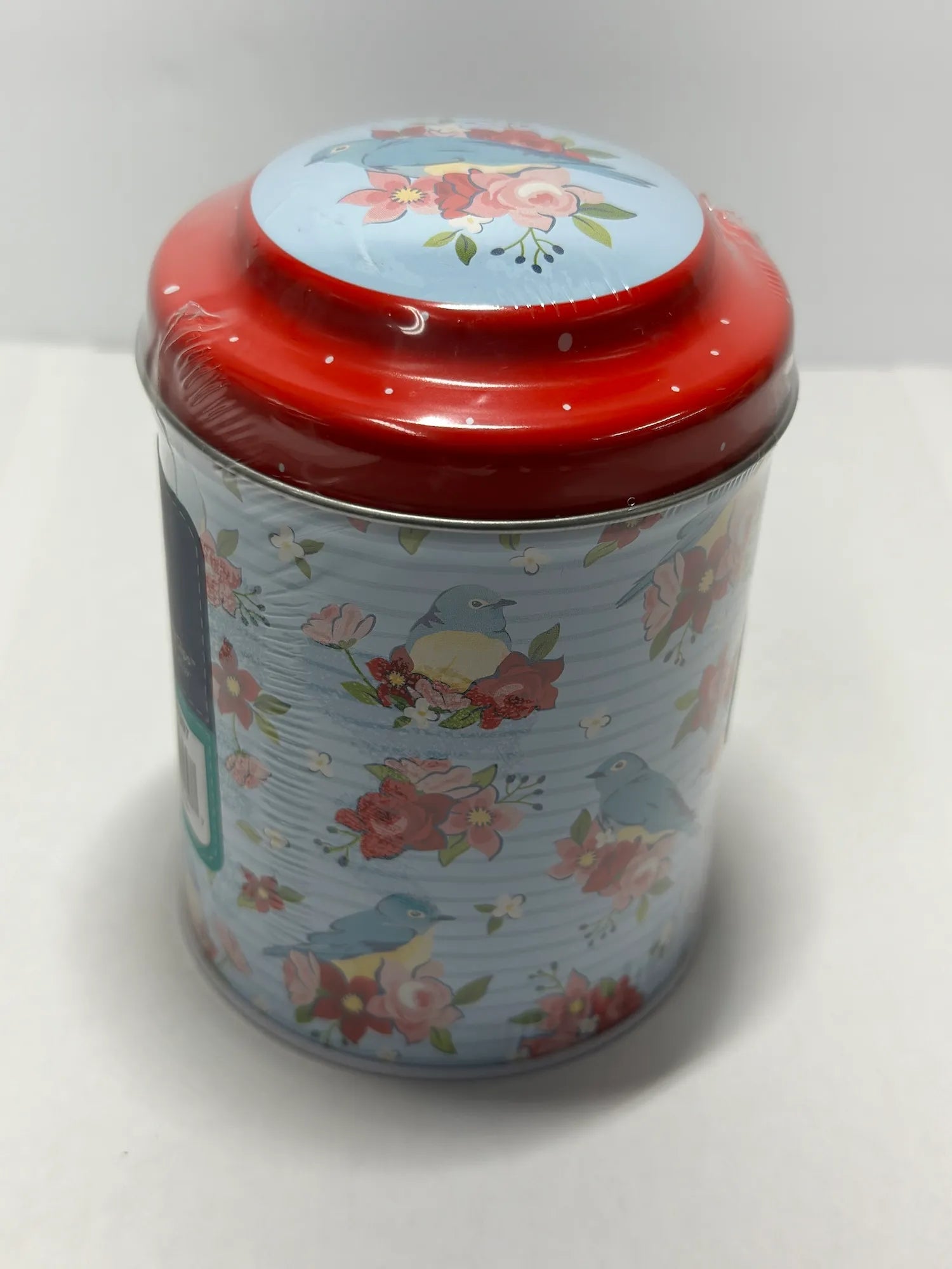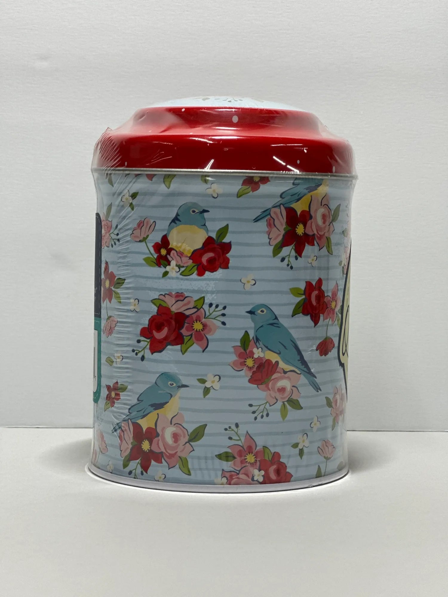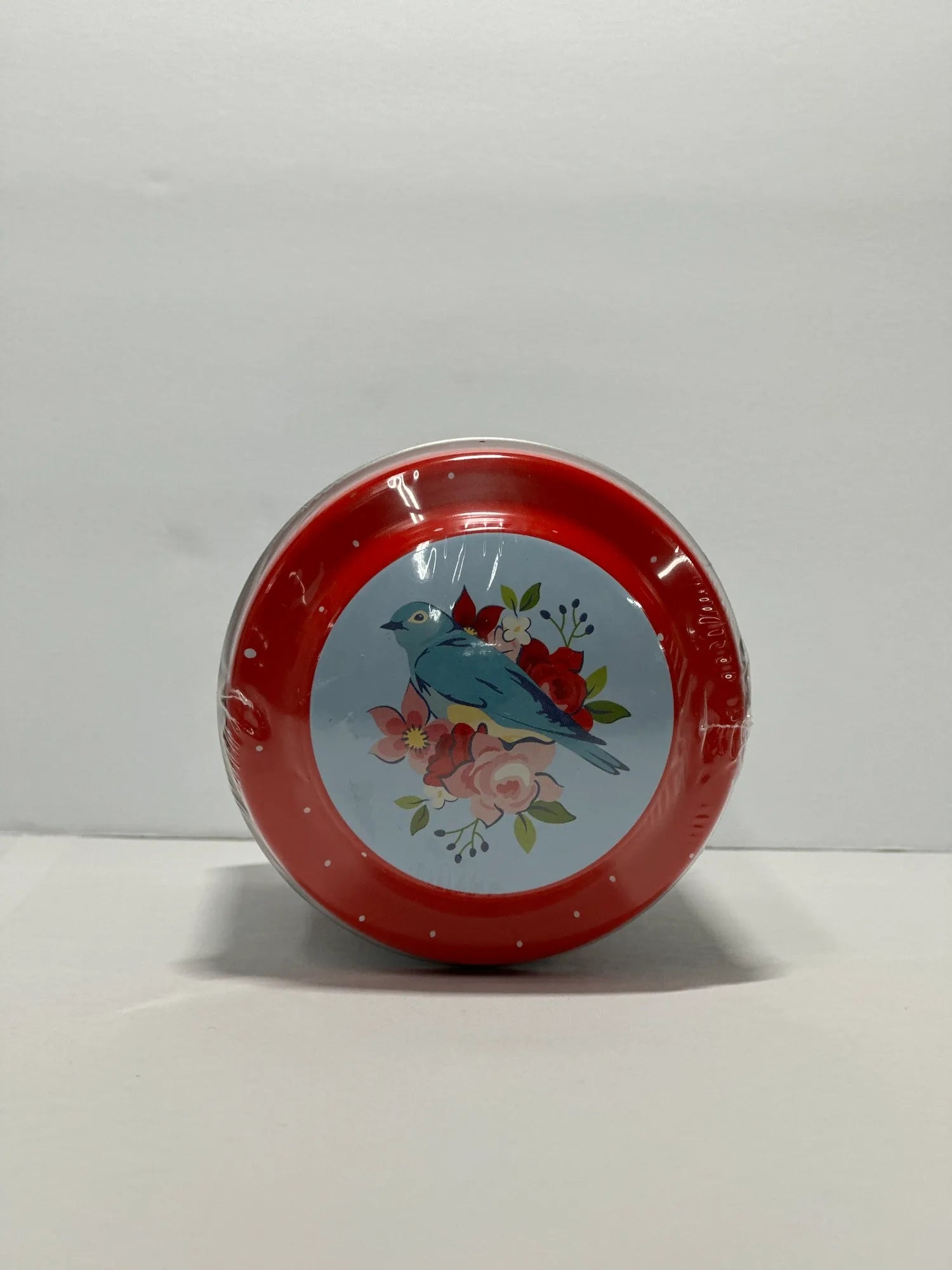 A blue storage tin with a red lid. Decorated with red and pink flowers and Riley Blake's signature blue bird.