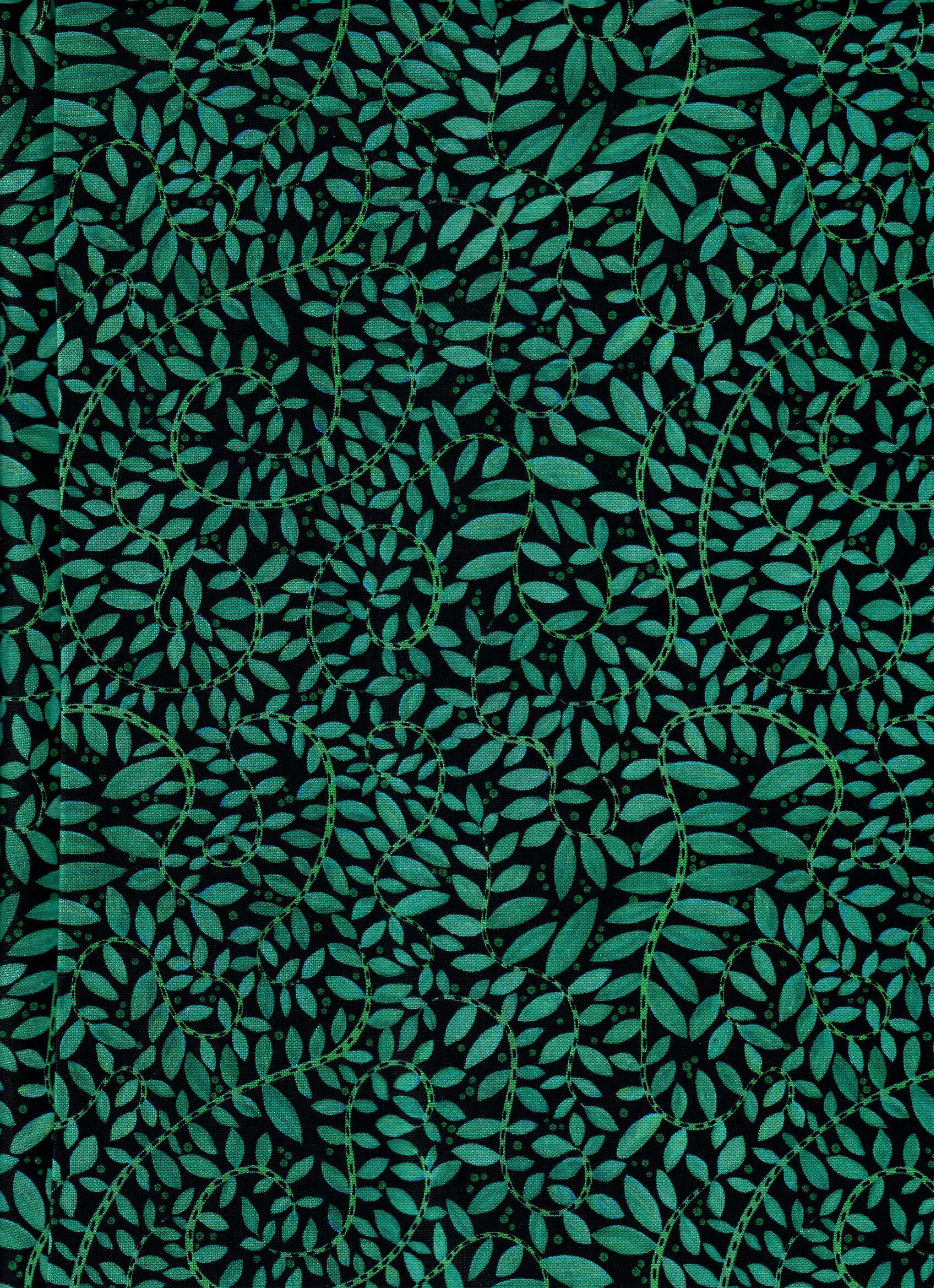 A deeply saturated teal green fern print in a serpentine pattern on a black background.
