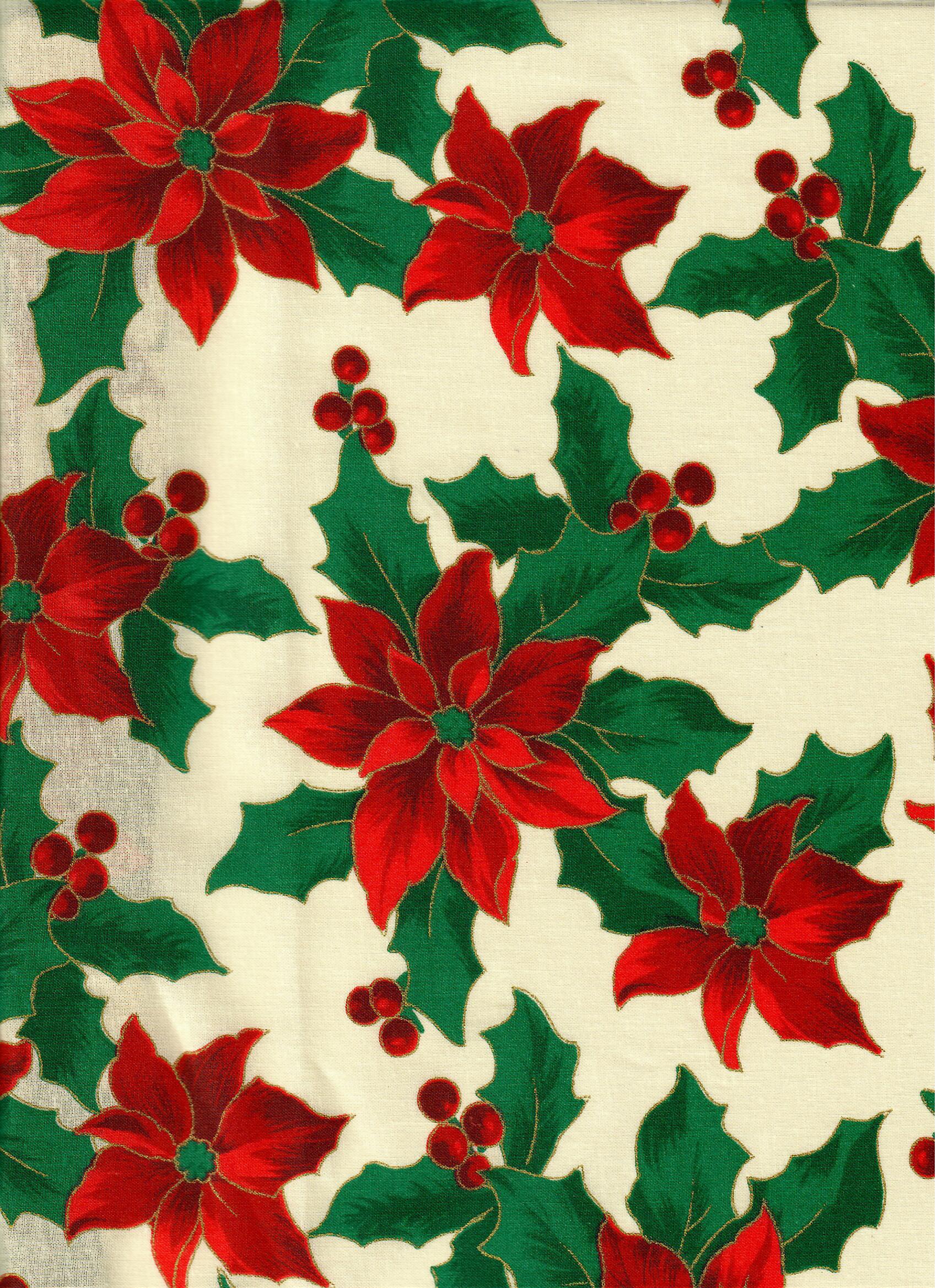 Beige/off-white background with red poinsettias with green leaves and a metallic gold outline.