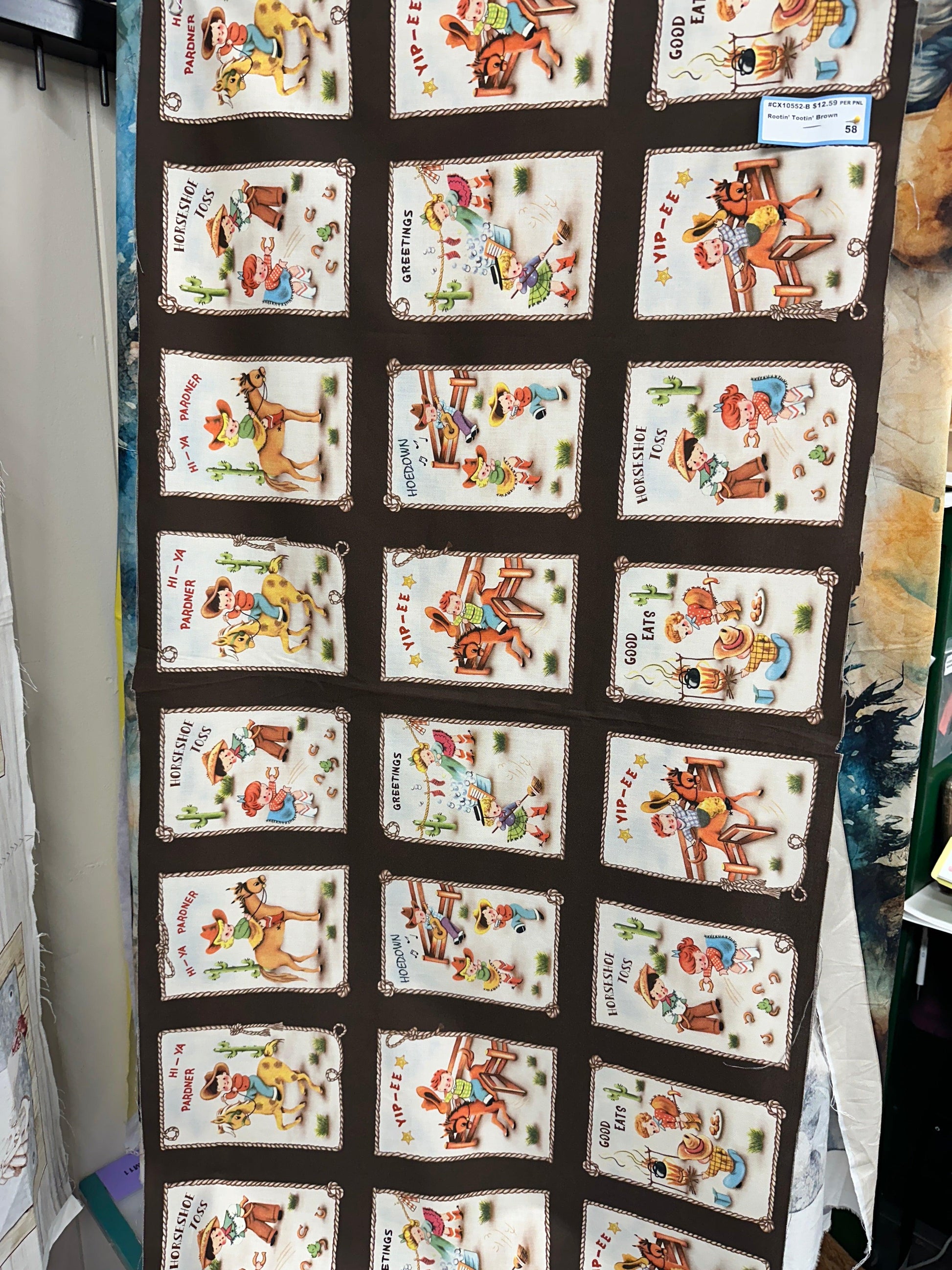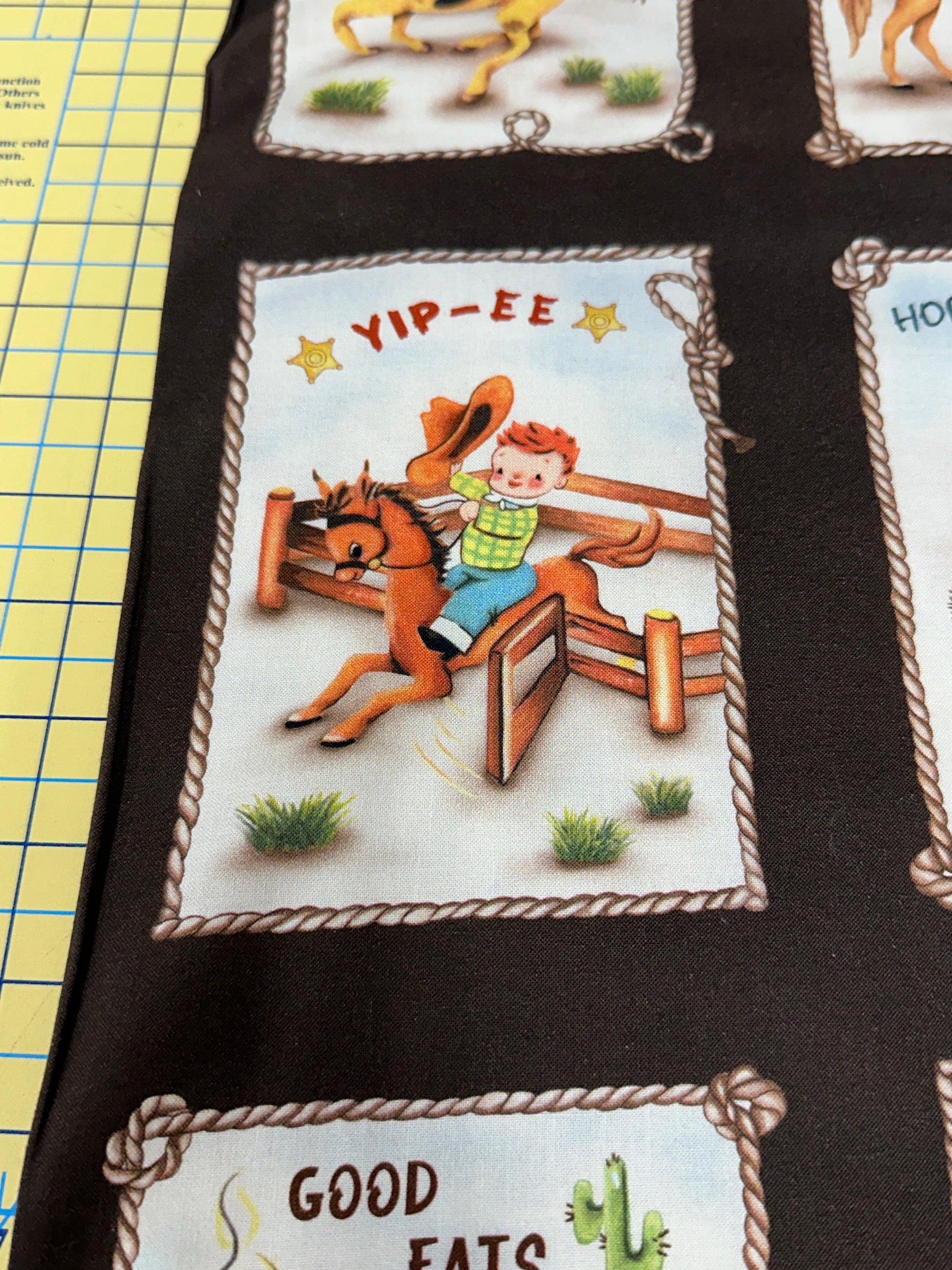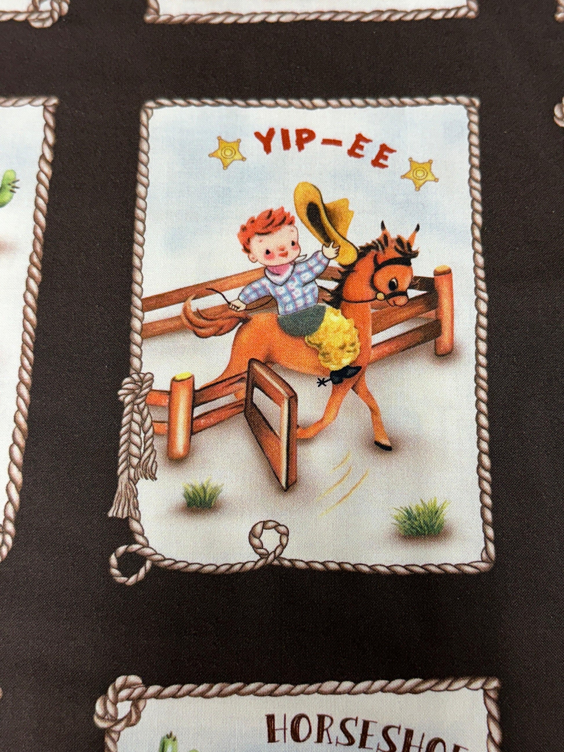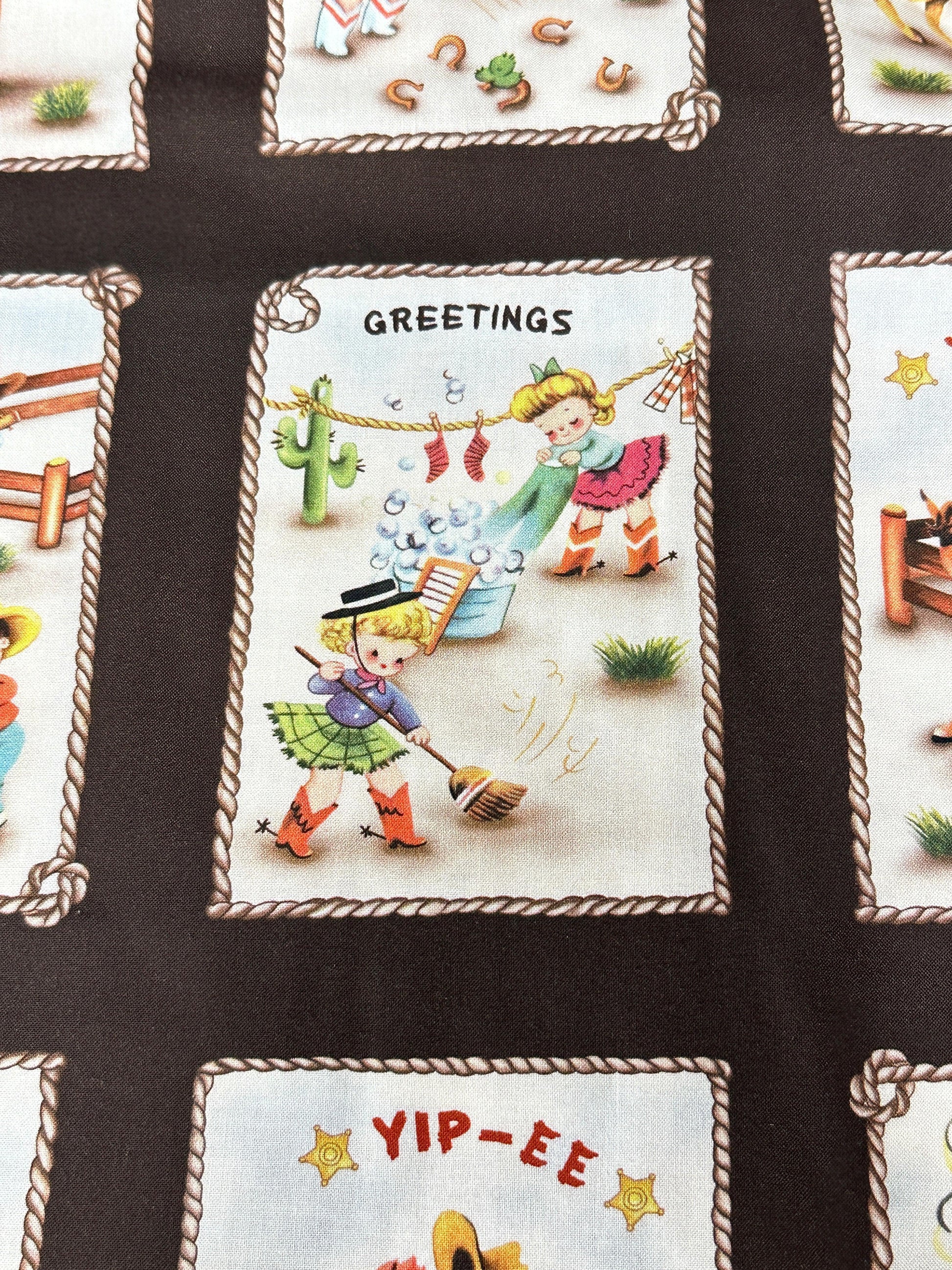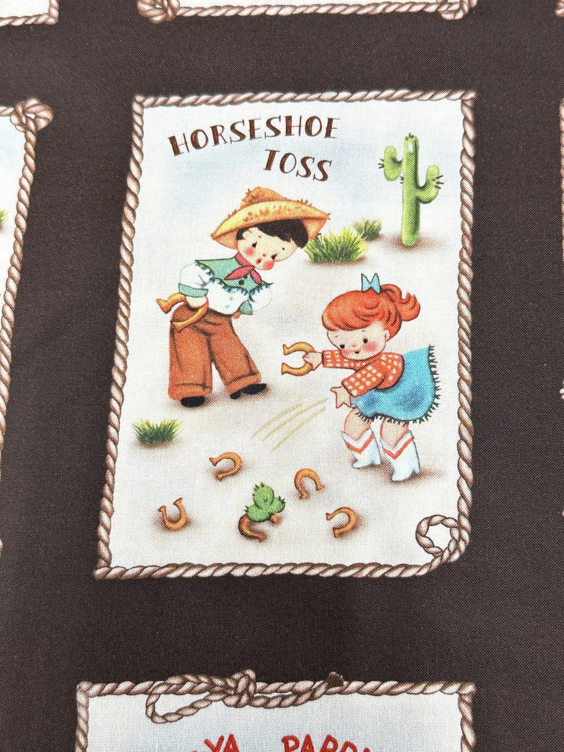 Rootin' Tootin' cowboys and cowgirls live at this adorable happy homestead. Can be used as a whole panel or individual patches.