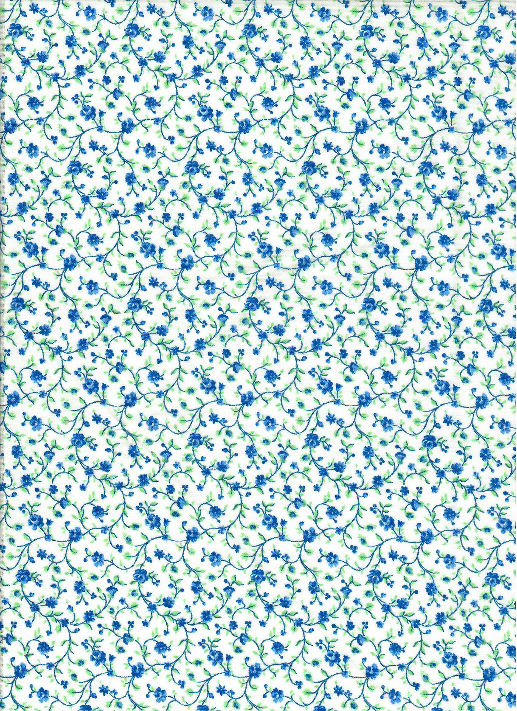 White fabric with blue vines of blue flower blossoms with small green leaves.