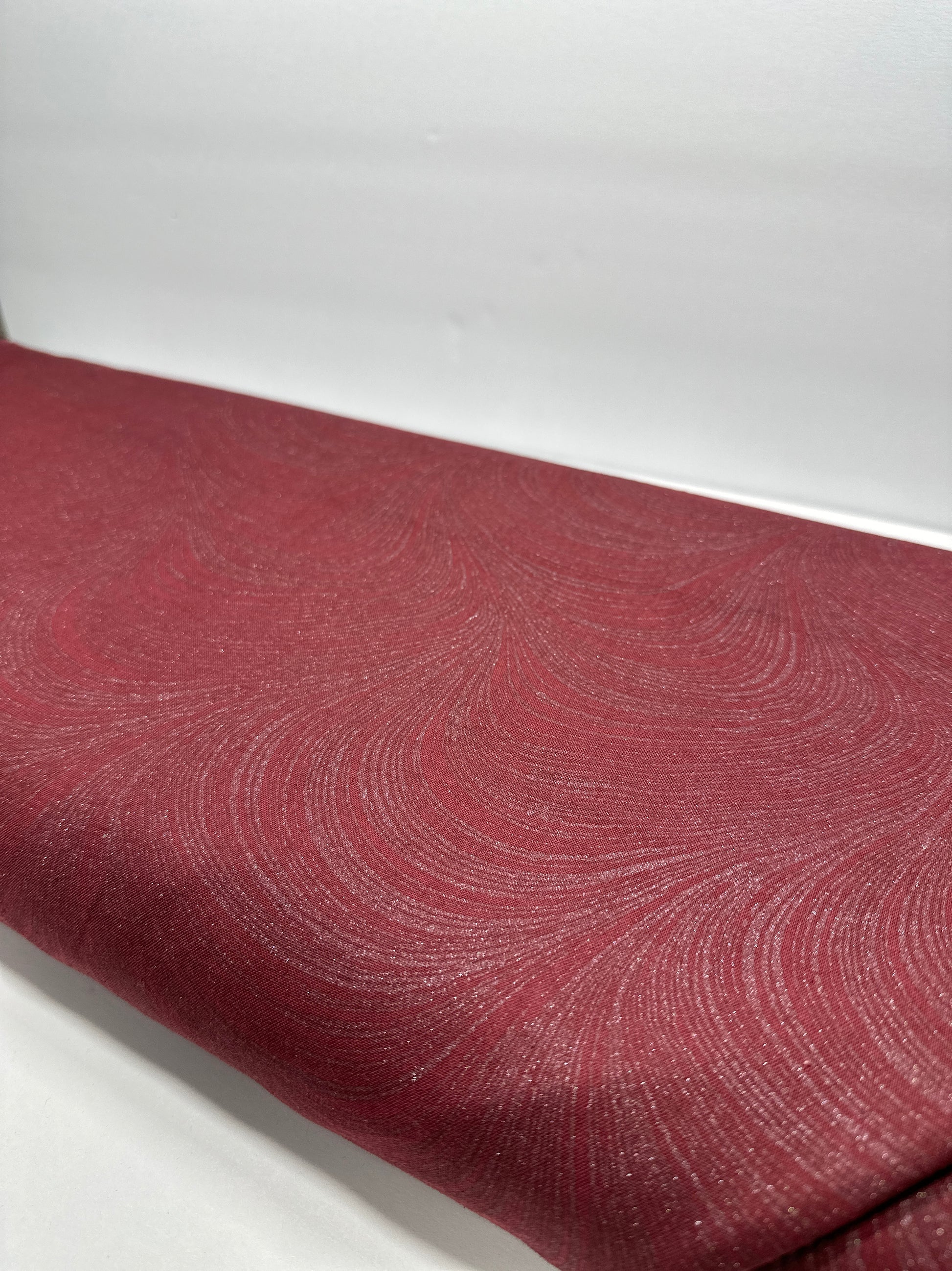 Faded-burgundy fabric with pearlescent wavy streaks which give the material a shimmery appearance.